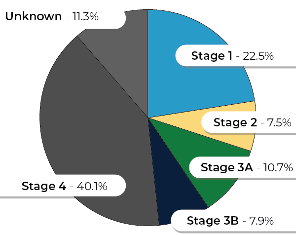 The percentages of non-small-cell lung cancers (NSCLCs) diagnosed at each stage at the time of presentation (in the UK) are shown in the chart.